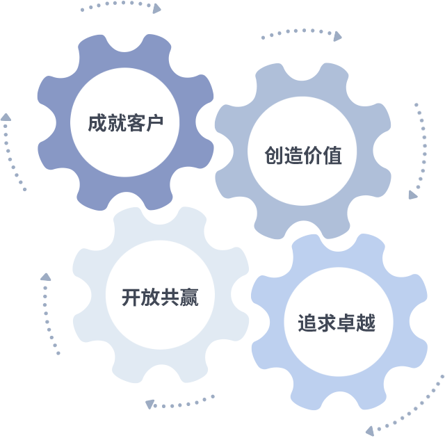 成就客户是一切决策的出发点,,,创造价值是衡量所有工作的标准,,追求卓越是我们做事做人的态度,,,开放共赢是我们的格局也是最终的结果。。价值观的齿轮环环相扣,,,,推动着组织里的每个人不断向前。。。